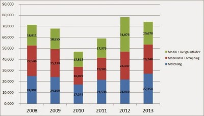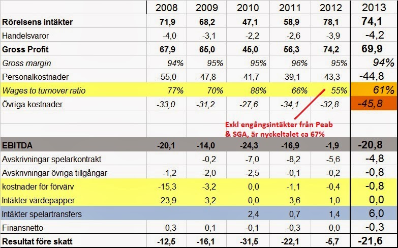 Och tittar man t.ex. på personalkostnader plus avskrivningar på spelarkontrakt dividerat med antal inspelade poäng så är det lika med 1.27 miljoner per poäng. Detta är bättre än vad klubben har presterat tidigare år och skulle kunna jämföras med motsvarande siffra för MFF under 2013 som visar 1.32 miljoner kronor per inspelad poäng. Så nog har ekonomin blivit bättre under 2013. I alla fall om man mäter den i termer av den sportsliga effektiviteten.