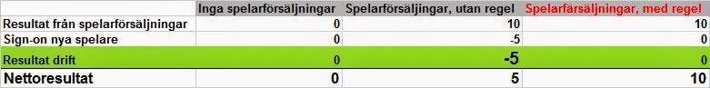I den andra kolumnen ser vi vad som händer med driftresultat om en klubb gör en vinst på spelarförsäljningar på 10 miljoner kronor och rekryterar en ersättare. Man får betala en sign-on bonus, detta exempel på miljoner kronor, som alltså måste kostnadsföras under samma år. Det medför att driftresultatet blir negativt, minus 5 miljoner kronor. Det tycker inte vi är okej. Därför inför vi nu denna regel. Klubbarna måste vänta till årsskiftet med att göra den där värvningen som skapar driftunderskottet så att man inte redovisar ett negativt driftresultat under 2014.