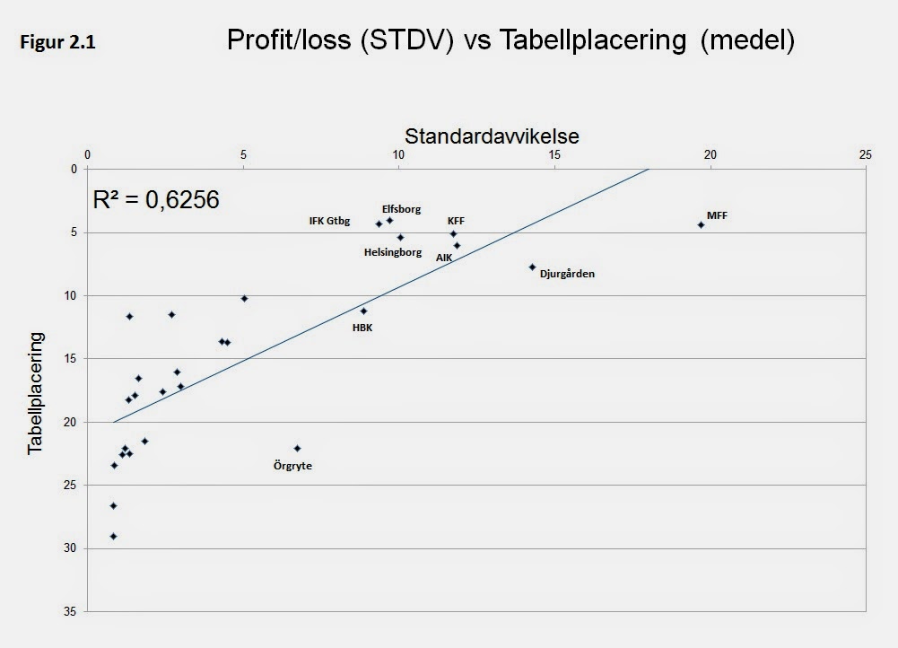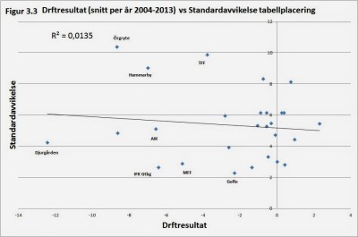 Man skulle kunna tro att klubbar som når sportsliga framgångar över en längre tidsperiod gör det tack vare att man levererar jämna finansiella resultat från år till år. För att ta reda på om det förhåller sig på det viset så har jag använt mig av standardavvikelsen för respektive klubbs finansiella resultat i förhållande till respektive klubbs sportsliga genomsnittsresultat. Om de årliga resultaten ligger samlade nära medelvärdet för tioårsperioden blir standardavvikelsen låg, medan årliga resultat som är spridda långt över och under medelvärdet ger en hög standardavvikelse.