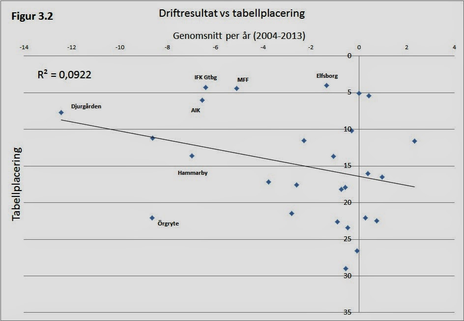 Svenska Fotbollsförbundet har presenterat sin årliga analys av de allsvenska klubbarnas ekonomier. Som vanligt läggs mycket kraft på att skriva om det finansiella utfallet för hela ligan. Jag har tidigare skrivit om att det är ganska ointressant eftersom det för det första, bör ses över en längre tidsperiod. För det andra, bör det snarare analyseras på klubbnivå. Därför har jag för första gången ansträngt mig lite mer och försökt att analysera de allsvenska samt ett antal av superettanklubbarnas resultat. Tidsperioden är 10 år och urvalet är 27 klubbar (18 för 2013). För att komma med har man varit tvungen att spela som minst 5 år i någon av de högsta serierna. Totalt finns det 261 observationer.