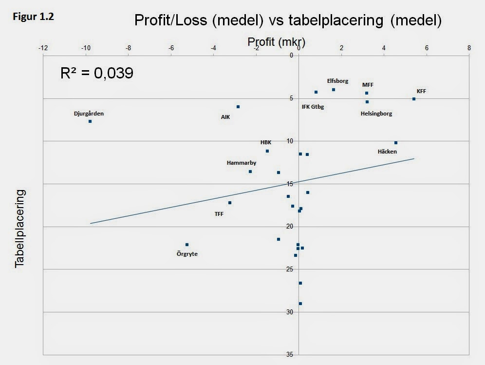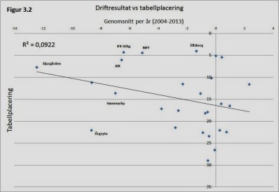 Årliga nettoresultat samt driftresultat ges alldeles för stort utrymme och för mycket uppmärksamhet eftersom det inte säger oss någonting om vare sig klubbarnas förmåga att prestera på fotbollsplanen eller deras överlevnad. Trots förluster både enstaka år och totalt för mätperioden som startade 2004 har ingen klubb försvunnit. Nio av fjorton spelar idag i allsvenskan. Tre återfinns i Superettan. En i division 1 och en i 2:an.