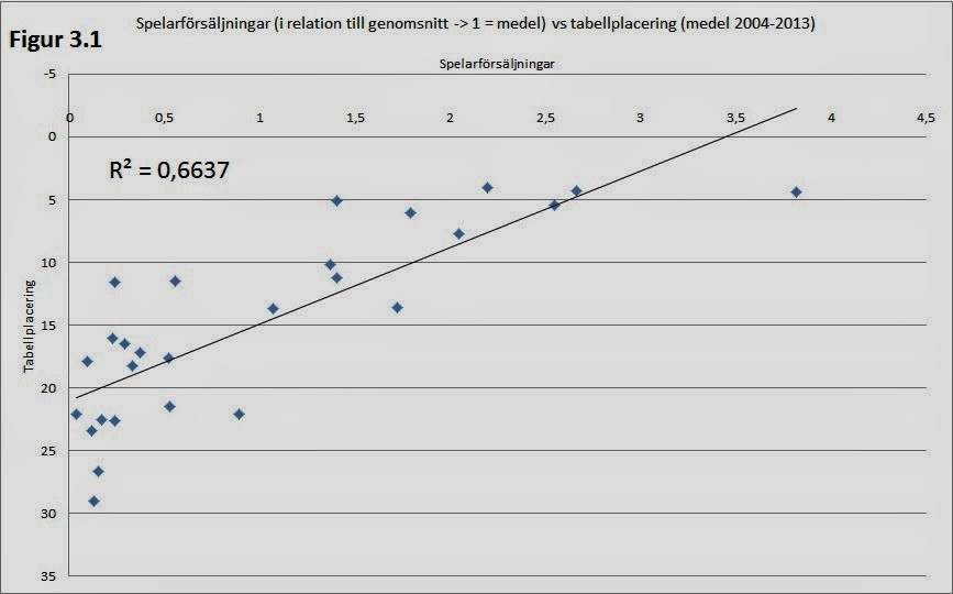 Figur 3.1 visar förhållandet mellan spelarförsäljningar och sportsliga framgång. Här kan vi se ett tydligt samband. Ju mer pengar klubbar har fått in tack vare spelarförsäljningar desto bättre sportsliga resultat har man generellt uppnått.