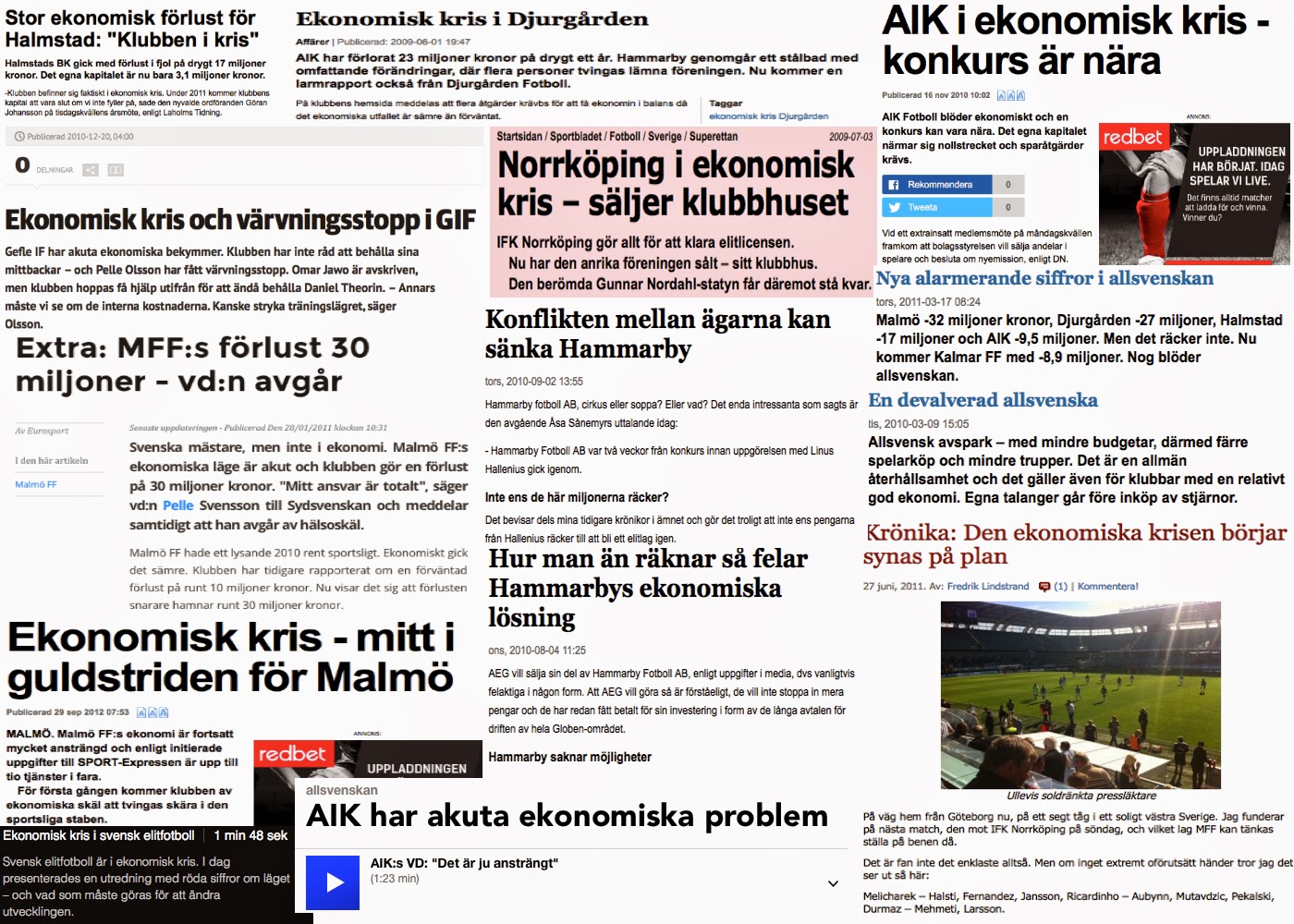 Där menade jag att klubbarna skulle få banta sina kostymer men att jag inte var orolig för klubbarnas överlevnad. Fotbollsindustrin är kanske den mest stabila industrin som finns. Sedan 2009 har vi kunnat läsa oerhört många rubriker om klubbarnas ekonomiska kriser. Jag har gjort ett litet kollage med ett mindre snabb-googlat urplock.
