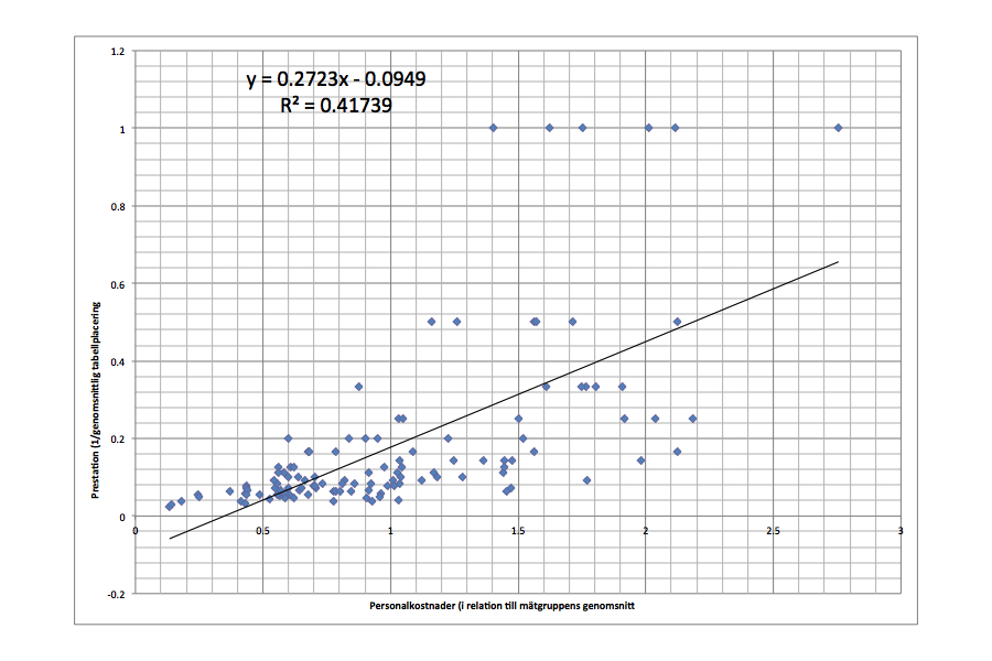 Faktum är att 4 av 6 mästerskap har vunnits av klubbar med högst eller näst högst personalkostnader. 1/3 av klubben med tredje högst personalkostnader. Helsingborg överraskade med att vinna en gång med femte högst personalkostnader. Detta kan jämföras med den statistik som Uefa härom året tagit fram från 52 av de europeiska ligorna. 29 av dem (56 %) vanns av klubben med högst personalkostnader. Lagen med näst högst personalkostnader vann i 11 av ligorna (21 %) och tredje högst personalkostnader vann fyra gånger (8 %). Klubbarna med lägre relativa personalkostnader än så vann 8 mästerskap, 15 %.