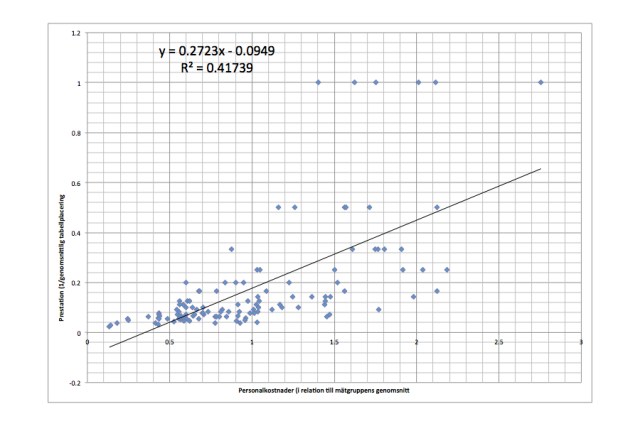 För två år sedan gjorde jag denna analys på svensk elitfotboll perioden 2009 – 2012. Nu finns det data för sex säsonger, 2009-2014. Det är tydligt att sambandet mellan klubbarnas relativa personalkostnader och de relativa sportsliga resultaten är starkare under den två år längre mätperioden. Förklaringsgraden är hela 86 procent vilket liknar de andra ligorna i Europa förhållandevis väl. De klubbar som befinner sig ovanför regressionslinjen har varit mer effektiva än urvalsgruppens genomsnitt och vice versa.