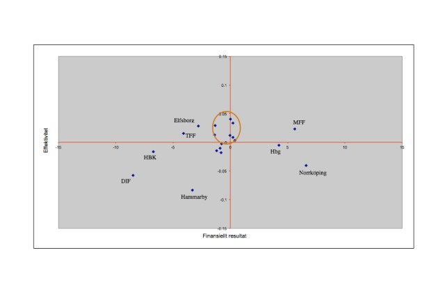Vi kan också se en förhållandevis effektiv klunga med klubbar som under perioden har visat ett resultat mycket nära noll alternativt ett negativt finansiellt resultat. Detta visar med stor tydlighet att de svenska elitklubbarna är nyttomaximerande. De använder alla till buds stående medel för att på kort sikt bibehålla förbättra sin sportsliga prestation. Gick man in i 2009 med ett positivt eget kapital så har det kapitalet använts till att försöka hamna högre upp i tabellen. Vilket rimligen har lett till negativa siffror i resultaträkningen, trots att de sportsliga prestationerna inte har varit ineffektiva i sig.