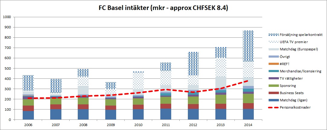 | Den transparenta delen i staplarna visar det man i Sverige definierar som ”grädden på moset” men som FC Basel har omvandlat till ordinära intäkter. Datakälla: http://www.fcb.ch |