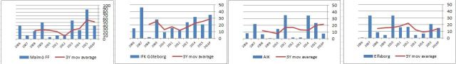 Figuren nedanför visar att så är fallet för flera klubbar som vanligtvis konkurrerar om de högsta platserna i allsvenskan. Det är så pass tätt i om Europaplatserna i allsvenskan att man inte har råd med dåligt resursutnyttjande. Att inte kunna räkna med och ta höjd för försäljning av spelarkontrakt när man de facto gör det kontinuerligt är inget annat än dåligt resursutnyttjande. Få klubbar kan dock göra det hela vägen på grund av de har ett för litet eget kapital.