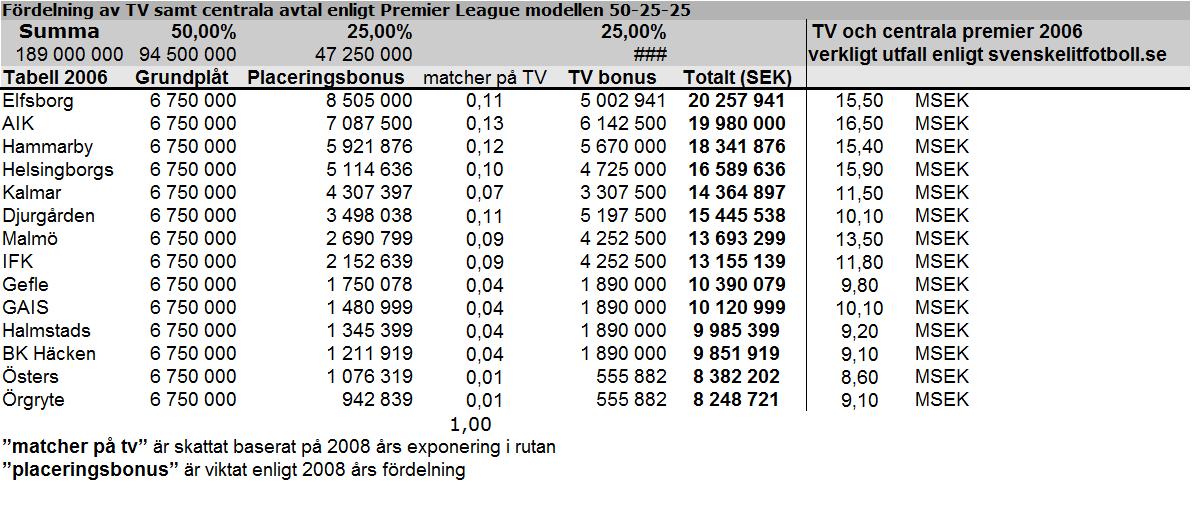 Till höger finns det som de facto betalades ut 2006 enligt de siffror som presenterades på svenskelitfotboll.se efter säsongen 2006.