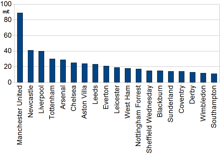 fig3. Bilden visar intäkterna säsongen 1996-7. datakälla: Winners & Losers – Stefan Szymanski & Tim Kuypers 2000