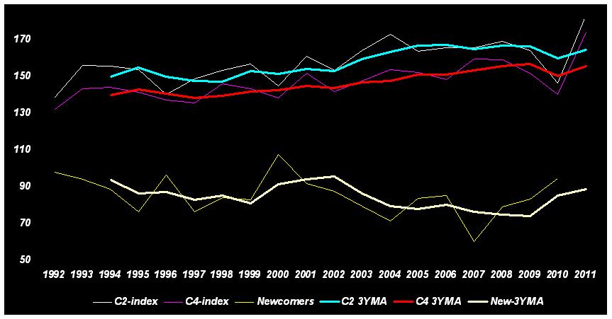 Ganska väntat har ryktet tagits emot med en stor skepticism. Men frågan är naturligtvis hur öppen dagens Premier League egentligen är? Följande figur visar tävlingsbalansen i Premier League sedan dess start 1992. Jag har fokuserat på tre olika nyckeltal. C2 index illustrerar de två bästa lagens vunna poäng i förhållande till antal poäng som samtliga klubbar i ligan har vunnit. C4 index visar ett samma förhållande men för ligans fyra bästa lag och newcomers index visar nykomlingarnas andel av ligans utdelade poäng. De tjocka linjerna visar 3 års glidande medeltal för respektive nyckeltal. Det vi ser är att Premier League så är trenden ganska tydlig: topplagen har tagit allt fler poäng och nykomlingarna allt färre. Den förra säsongen var ett undantag vilket jag förklarar i detta inlägg.