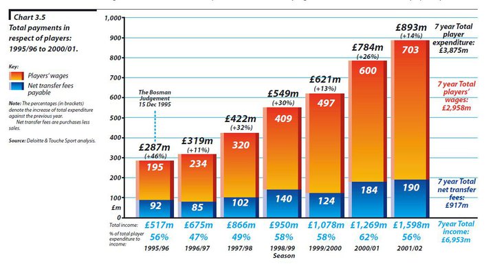 Man skulle kunna fråga sig om varför Arsenals strategi fungerade bättre i början av 00-talet. Klubben har trots allt inte bytt manager eller gjort några andra större strukturella förändringar. Simon Kuper menade för ett tag sedan i en FT krönika kring att konkurrenterna har lärt sig och anammat de verktyg som Wenger tog till engelsk fotboll, dvs knowledge spillover. Men figuren nedan ger ytterligare en bild av verkligheten där vi ser ett tydligt förändrat konkurrenslandskap. 2002 var Arsenal näst högst upp i hierarkin av klubbar som hade högst lönekostnader. Idag har man droppat två placeringar där Chelsea och Manchester City har upplevt en mycket stor ökning av sina respektive budgetar. Så även om en jämlik lönestruktur och därmed kvalitetsnivå kan förväntas ge en positiv effekt på prestationen så motverkas den av att spelarnas medelinkomster är betydligt lägre än i konkurrenternas trupper. Det är något som dels orsakar ett talangutflöde ur truppen gör det svårare att rekrytera redan produktiva spelare.