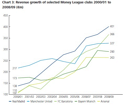 De spanska topp2 klubbarna har en extrem stark ställning på sin lokala hemmamarknad vilket är något som har stärkt deras konkurrenskraft utanför landets gränser. Båda klubbarna är dock till en inte helt obetydlig del starkt exponerade mot risken av en förändrad regim vad gäller upphandling av sändningsrättigheter. Figur5 visar tillväxten för ett fåtal utvalda klubbar i toppen av fotbollens näringskedja. Notera den höga tillväxten som de spanska klubbarna har haft tack vare den individuella försäljningen av sändningsrättigheterna. De engelska klubbarnas tillväxt (mätt i EUR) har de senaste två till tre åren bromsats ev det kraftigt försvagade pundet.
