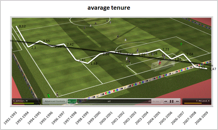 Parallellt upplever de mindre klubbarna en hård konkurrens i mitten och i de nedre regionerna av ligan vilket har resulterat i något av ett ”rat race” där klubbägarna i en desperat jakt på bättre resultat med mycket jämna mellanrum byter management. Figur3 visar den historiska utvecklingen för genomsnittliga tiden för en manager i Premier League. Säsongen 2008/09 var en managers medellivslängd på sin post nere på 1.47 år där ungefär hälften av managerkåren bytte jobb under säsongen.