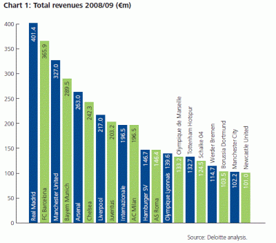 På den europeiska marknaden exponeras Manchester United mot konkurrens från de mest framstående klubbarna i de andra fyra storligorna. Figur4 visar de 20 största klubbarna i Europa och storleken på deras intäkter.