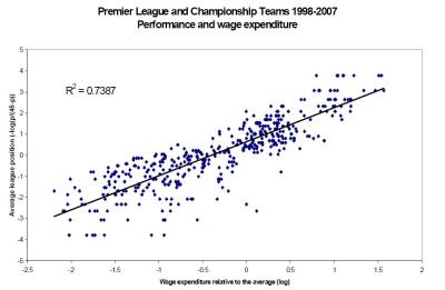 Figur2 visar det mycket starka sambandet mellan lönekostnader och tabellplacering i Premier League.