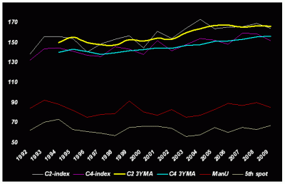 Figur 1 visar C2 samt C4 Index avseende topp2 respektive topp4 klubbarnas intjänade poäng i relation till ligans dito. Samma metod som när jag mätte tävlingsbalansen i den spanska ligan. Den gula och blå linjen är tre års glidande medeltal. Vi ser en relativt tydlig uppåtgående trendkanal.