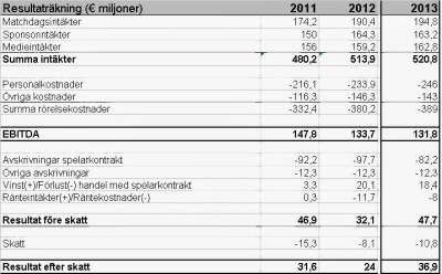Om man tittar på resultaträkningen i sin helhet så går det att konstatera: AIK letar fortfarande efter balans i resultaträkningen. Bruttoresultatet (gross profit) har blivit större. Trots att man möter intäkter från spel i Europa League under 2012. Klubbens möjligheter att kunna ha högre personalkostnader är med andra ord större än tidigare år. Möjlighet att ha höga personalkostnader i relation till andra konkurrenter är viktigt för att kunna leverera goda sportsliga resultat över tid. Vilket i sig är viktigt för att kunna behålla och öka sina intäkter.