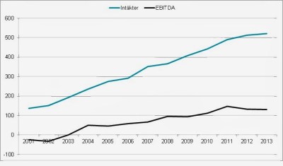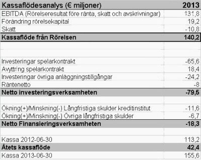 Enligt kassaflödesanalysen i kvartalsrapporten har AIK Fotboll AB under 2013 amorterat 2.86mkr på sina räntebärande skulder. För den del som hör ihop med förra årets förskottsbetalning borde det betyda att klubben under 2013 har bokfört en intäkt på resultaträkningen men det finns inget kassaflöde för intäkten i år. Skulderna minskar dock med den bokförda intäktens storlek. Är den årliga intäkten möjligen 13mkr/10år?